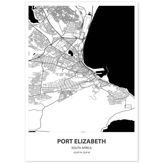 Lámina Mapa de Port Elizabeth, Sudáfrica en Negro