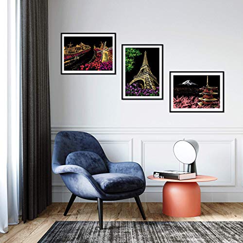 Láminas para Rascar de Torre Eiffel, Molinos Holanda y Monte Fuji - Serie Ciudades Scratch Painting