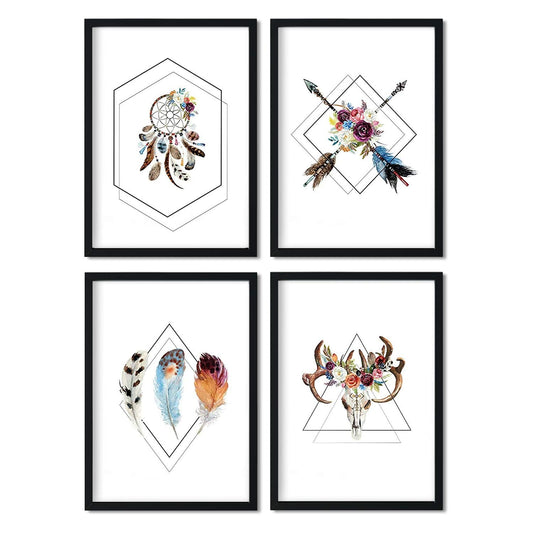 Set de 4 láminas de Formas Geometricas y Plumas Boho