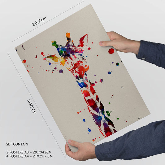 Set de 6 láminas de acuarela con jirafa, ciervo, flamenco y avestruz en colores vivos para decorar salón, estudio o dormitorio – 2 grandes y 4 medianos
