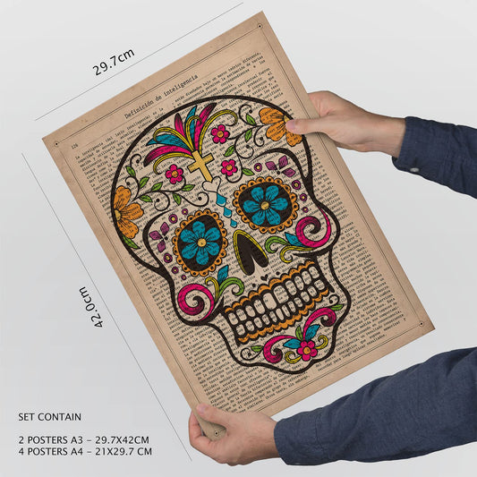Set de 6 láminas de calaveras mexicanas coloridas con fondo vintage de diccionario para decorar salón, pasillo o estudio original – 2 grandes y 4 medianos