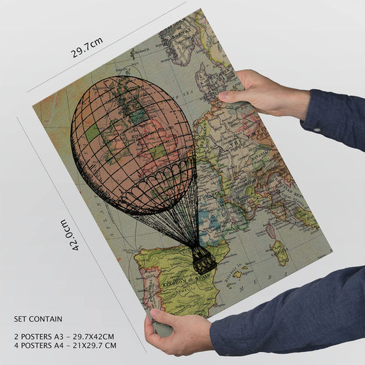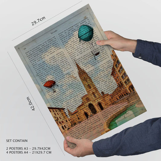Set de 6 láminas vintage de ciudades icónicas como París, Londres y Barcelona sobre páginas de libro con globos aerostáticos – 2 grandes y 4 medianos