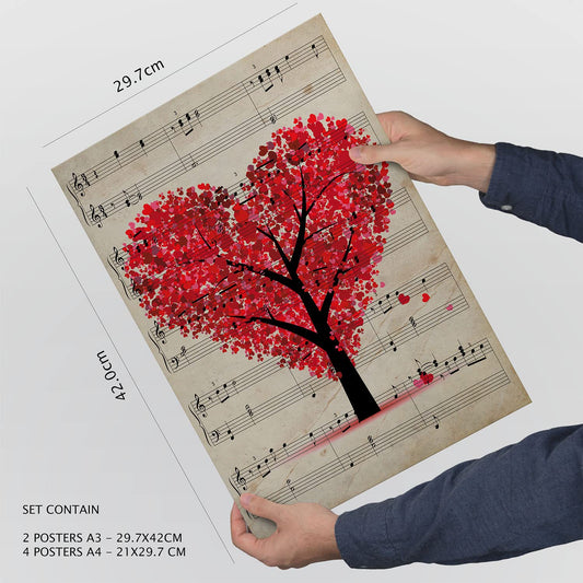 Set de 6 pósters vintage estilo collage con partituras, corazones rojos, mariposas y instrumentos musicales – ideal para salón, estudio, dormitorio o sala de música – piano, saxofón, violín, arpa, arte romántico y nostálgico