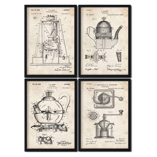 Pack de 4 Láminas Patentes de Cafeteras Antiguas en Negro
