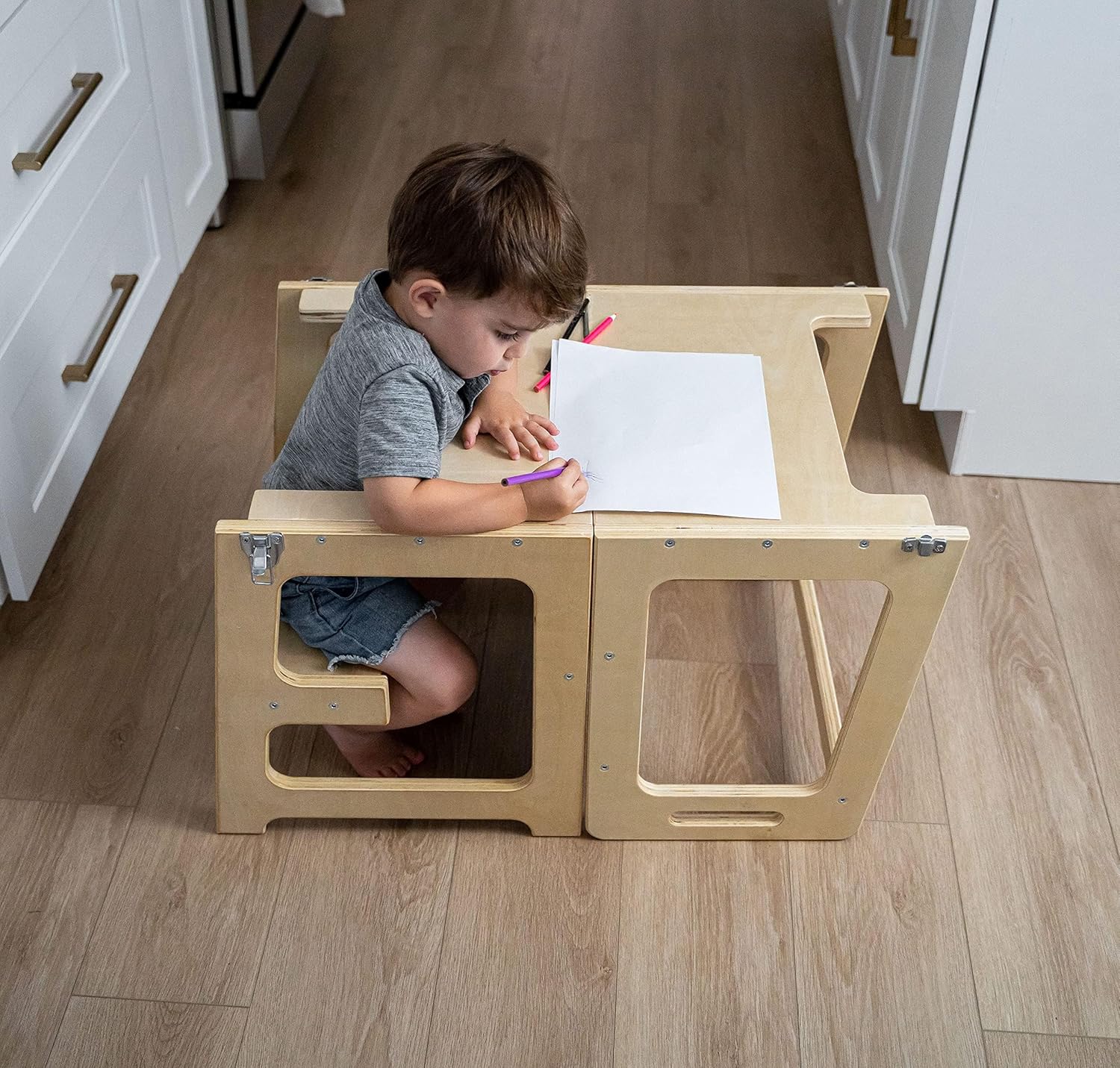 Avenlur Date - Torre plegable 4 en 1 - Taburete con escalón para niños pequeños con pizarra, escritorio y silla - Taburete estilo Montessori y Waldorf para edades de 18 meses a 6 años
