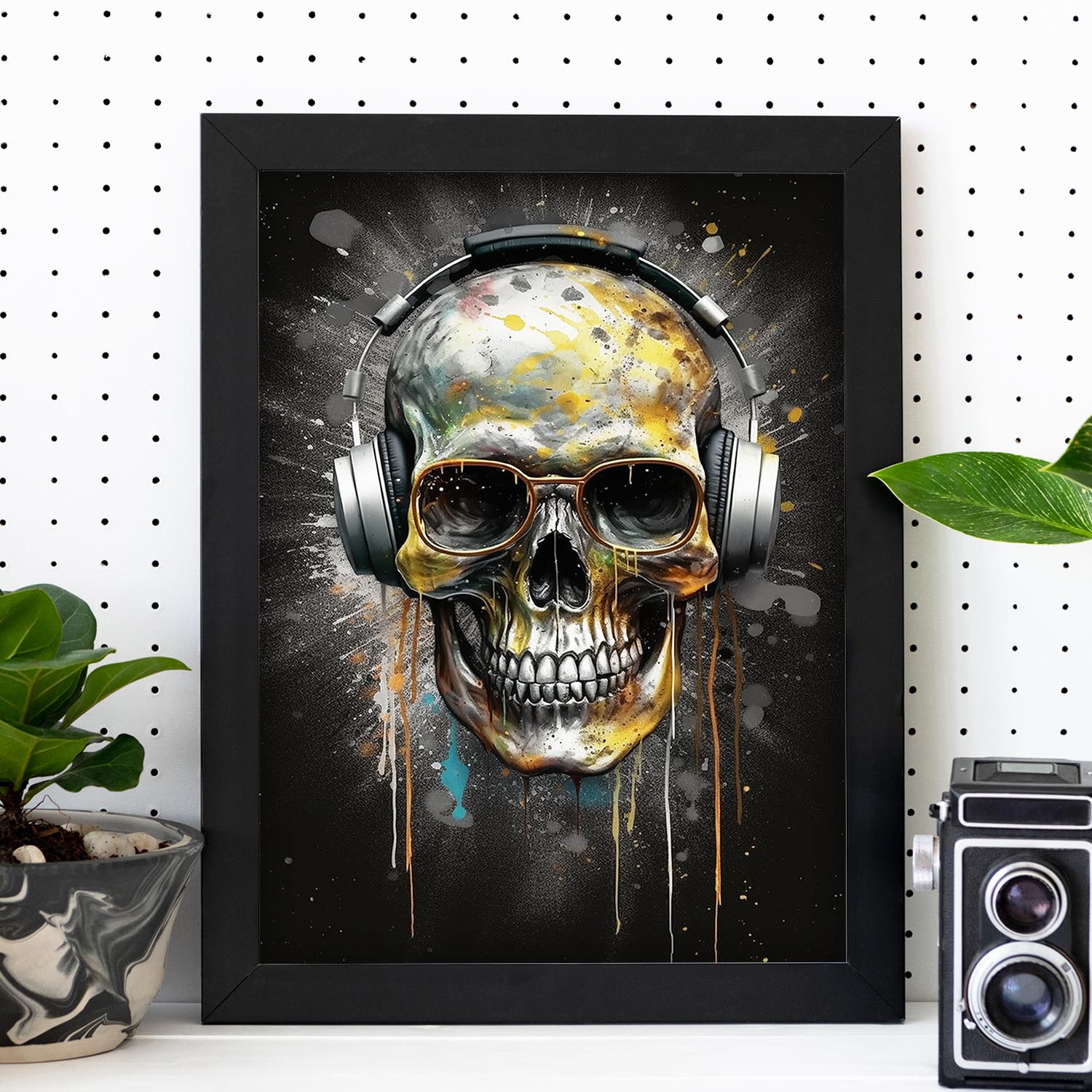 Lámina: Calavera Plateada y Dorada con Auriculares y Gafas de Sol