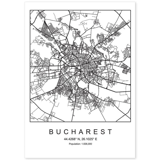 Lámina estilo nordico de mapa de Bucharest en blanco y negro