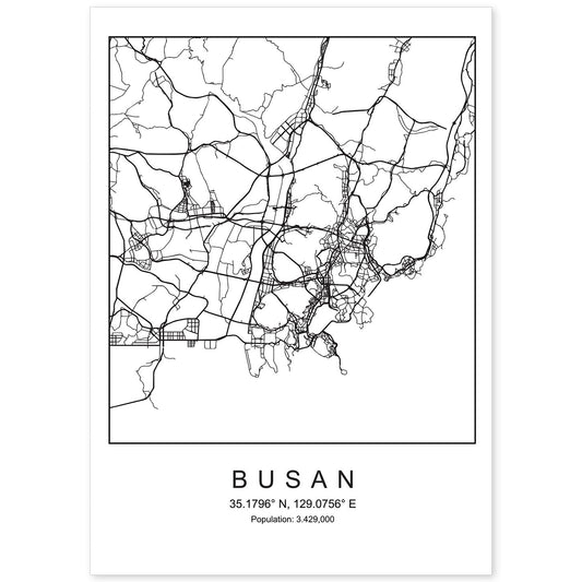 Lámina estilo nórdico de mapa de Busan en blanco y negro