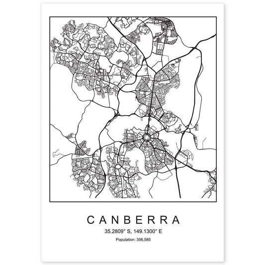 Lámina estilo nórdico de mapa de Canberra en blanco y negro
