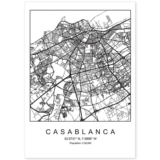 Lámina estilo nórdico de mapa de Casablanca en blanco y negro