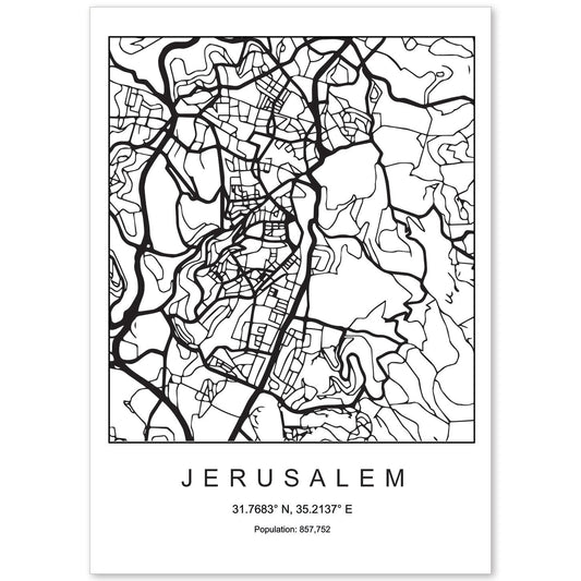 Lámina estilo nórdico de mapa de Jerusalem en blanco y negro
