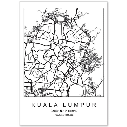 Lámina estilo nórdico de mapa de Kuala Lumpur en blanco y negro