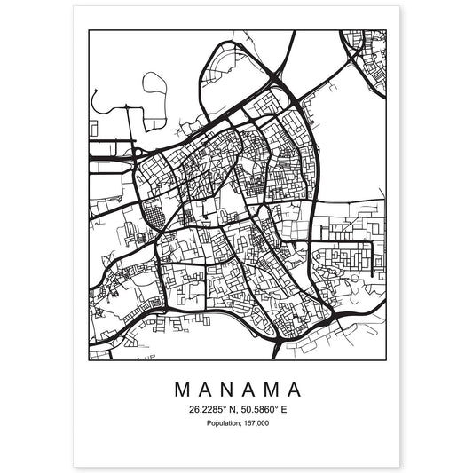 Lámina estilo nórdico de mapa de Manama en blanco y negro
