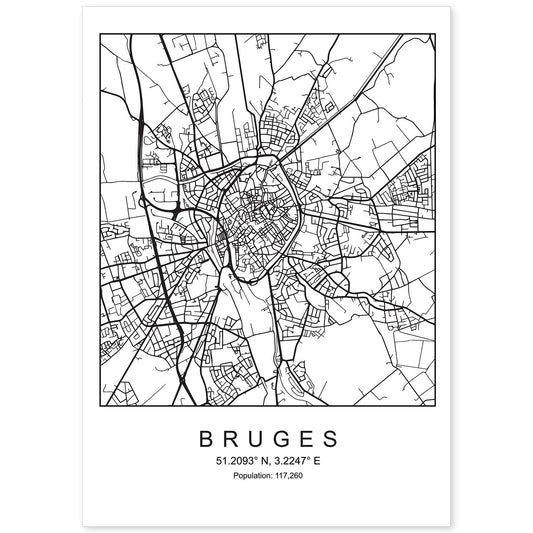 Lámina estilo nórdico de mapa Bruges en blanco y negro