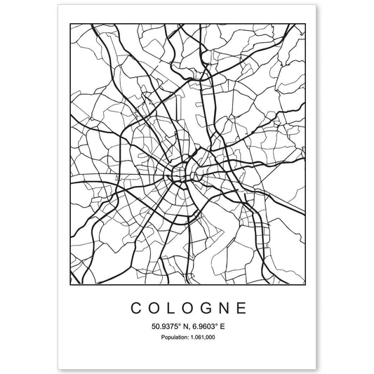 Lámina de mapa estilo nordico de la ciudad de Cologne en blanco y negro