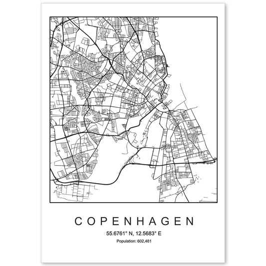 Lámina estilo nórdico del mapa de Copenhagen en blanco y negro