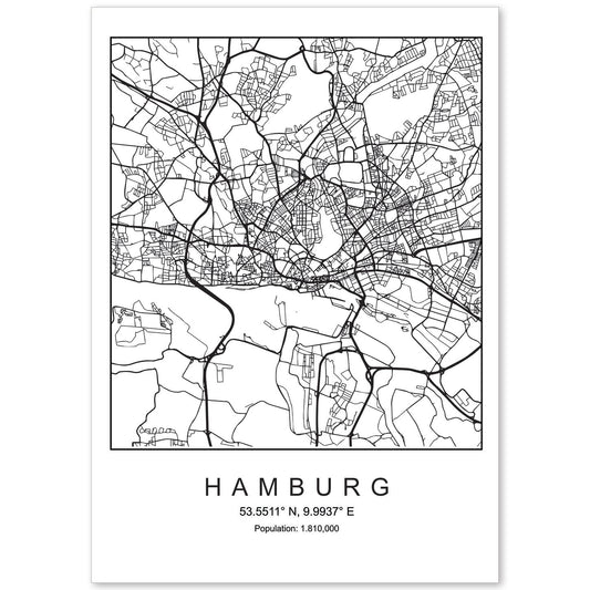 Lámina estilo nórdico de mapa de Hamburg en blanco y negro