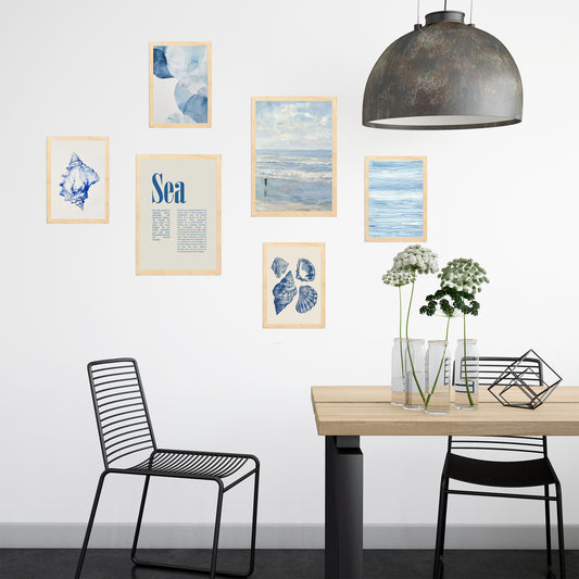 Set de 6 láminas estilo minimalista marino en tonos azul y beige con conchas, olas y texto inspirador para baño, salón o dormitorio costero, 2 grandes y 4 medianos