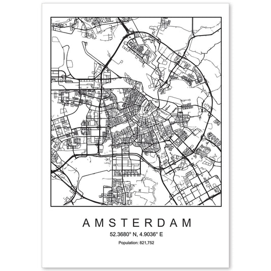 Lámina estilo nórdico de mapa de Amsterdam en blanco y negro
