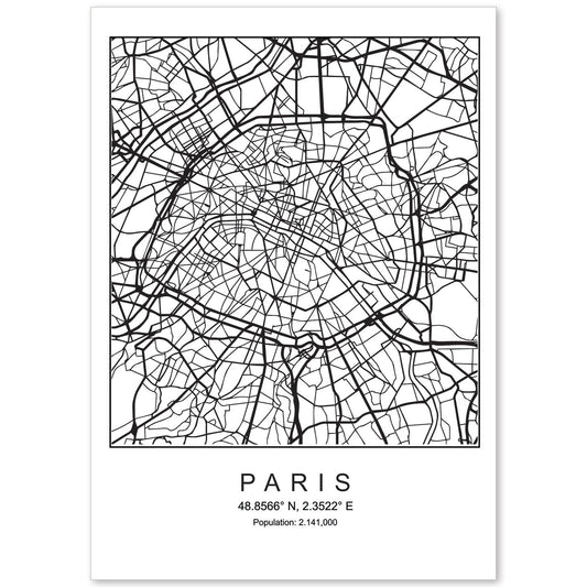 Lámina estilo nórdico de mapa de Paris en blanco y negro