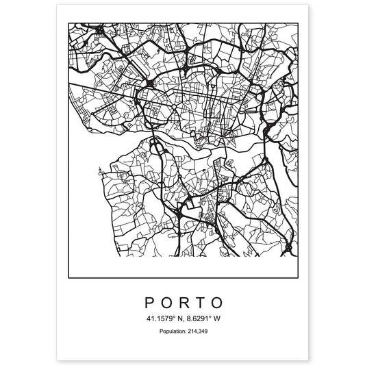 Lámina estilo nórdico del mapa de Porto en blanco y negro