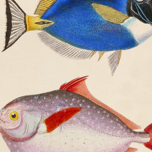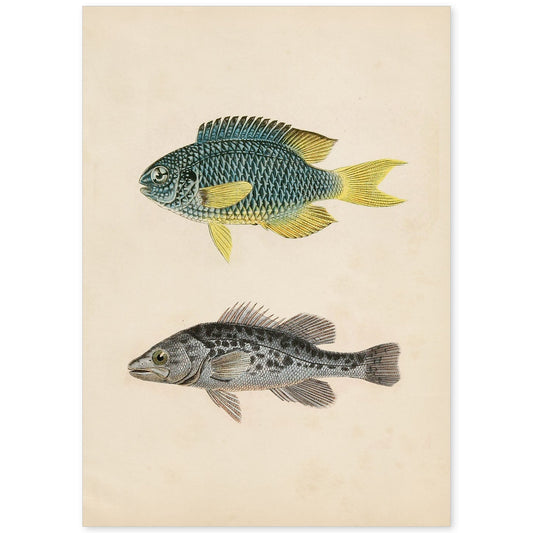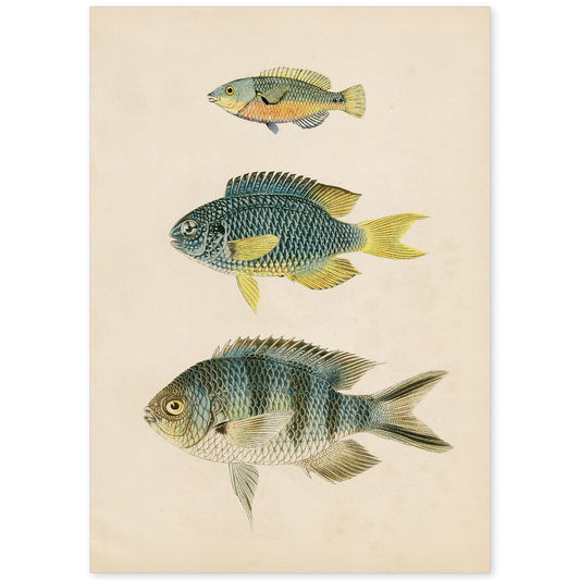 Lámina Vintage de Peces Azul, Amarillo y Gris