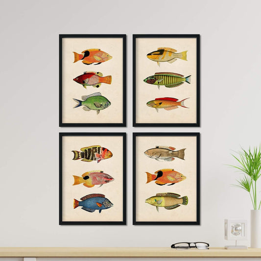 Set de 4 láminas vintage de peces coloridos Atlantico