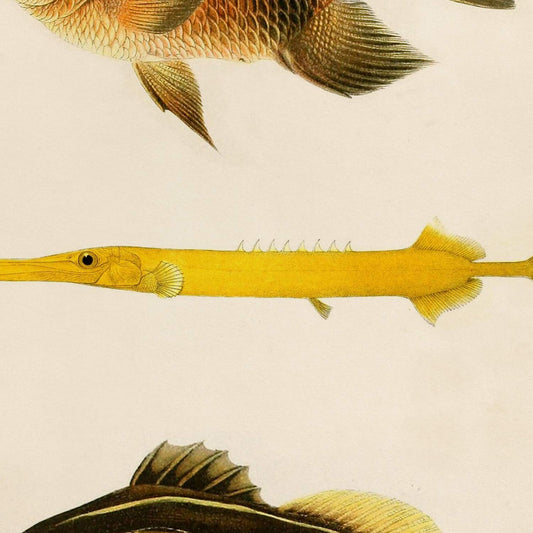 Láminas Vintage de Peces Coloridos en Tono Amarillo Marrón