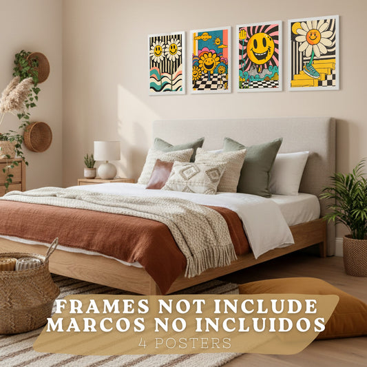 Set de 4 laminas decorativas Acid House Cuadros Salon modernos - Posters decorativos Smily Emoji flor Decoración Dormitorios Cocina Baño