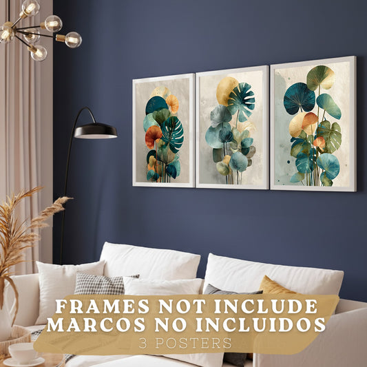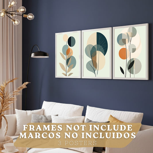 Set de 3 laminas decorativas Formas Abstractas Florales Cuadros Salon modernos - Posters decorativos azules verdes Decoración Dormitorios Cocina Baño