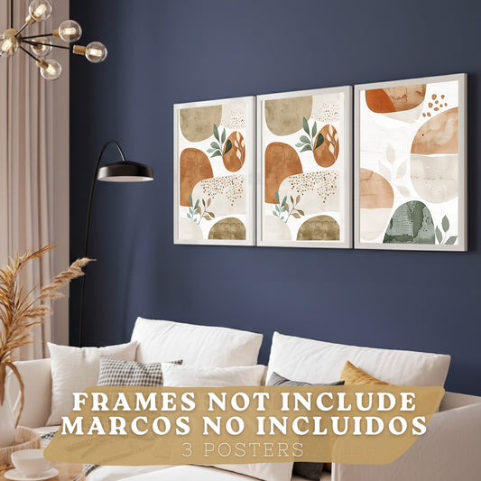 Set de 3 laminas decorativas Formas Abstractas Florales Cuadros Salon modernos - Posters decorativos Plantas verdes marrones Decoración Dormitorios Cocina Baño