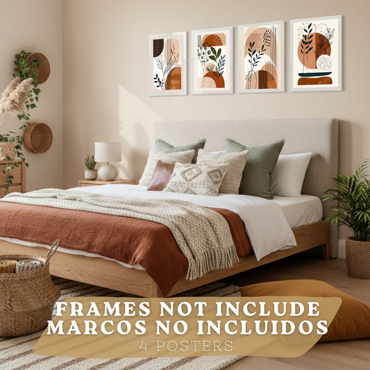 Set de 4 laminas decorativas Formas Abstractas Botanicas Cuadros Salon modernos - Posters decorativos Plantas marrones Decoración Dormitorios Cocina Baño