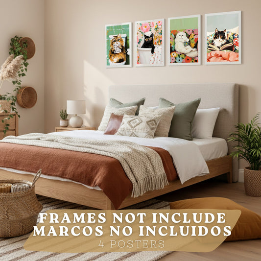 Set de 4 laminas decorativas Gatos divertidos Cuadros Salon modernos - Posters decorativos animales Decoración Dormitorios Cocina Baño