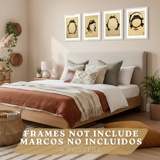 Juego de 4 laminas decorativas pared estilo Japon Ukiyo-e. Cuadros Salon modernos - Posters decorativos ranas vintage. Arte japones. Decoración Dormitorios.