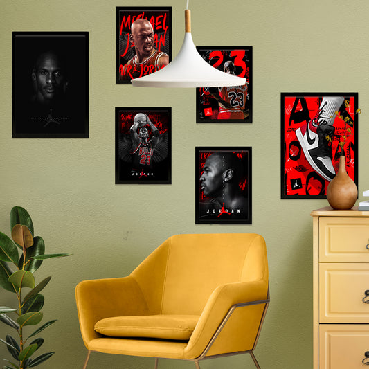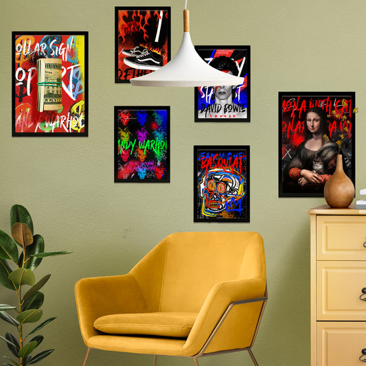 Set de 6 pósters icónicos de Basquiat estilo graffiti pop art con coronas, retratos y colores vibrantes para decorar hogar, oficina, estudio o tienda – 2 grandes y 4 medianos