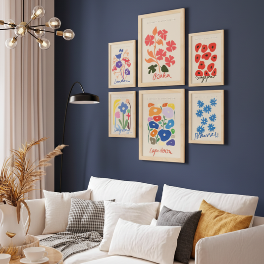 Set de 6 pósters estilo collage con diseños florales y abstractos inspirados en exposiciones artísticas para salón moderno o estudio creativo, 2 grandes y 4 medianos