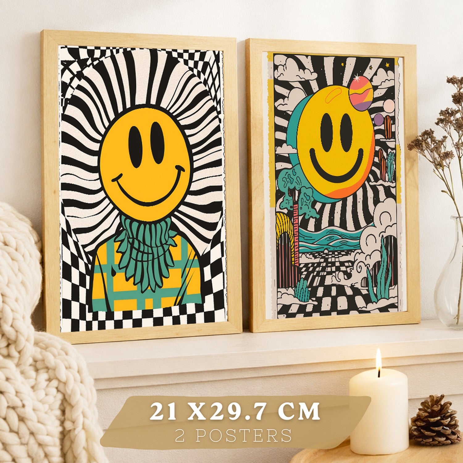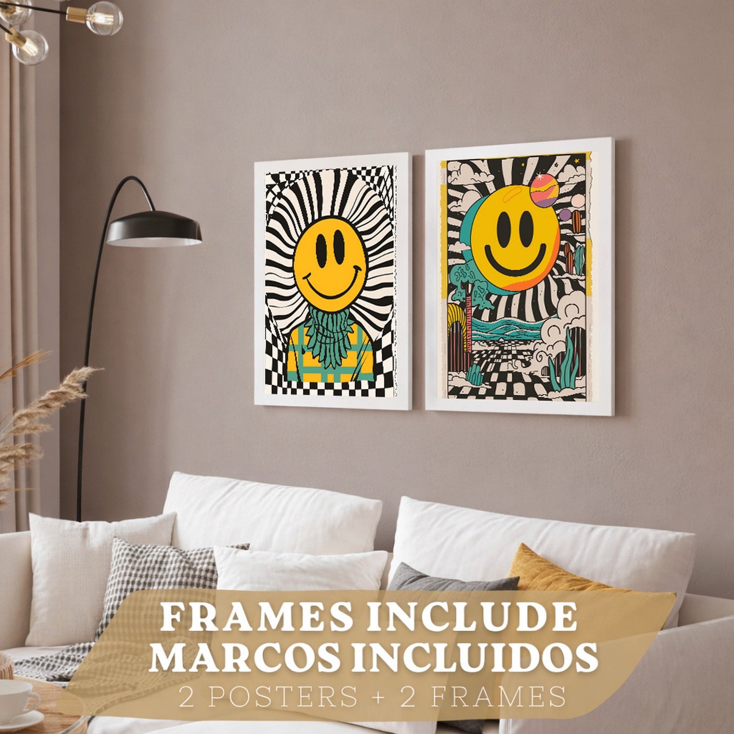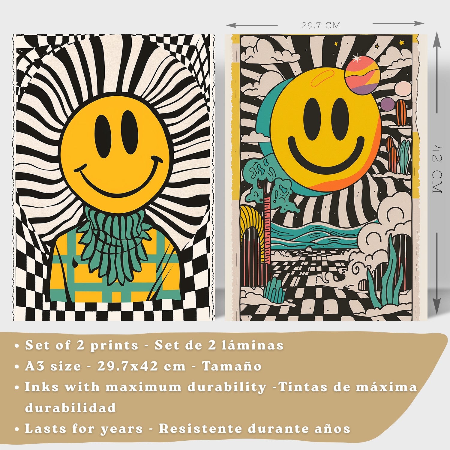 Set de 4 laminas decorativas Smiley Cuadros Salon modernos - Posters decorativos Emoji sonrisa Decoración Dormitorios Cocina Baño