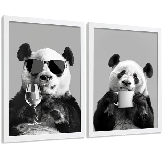 Set de 2 Láminas Panda Divertido Blanco y Negro Cuadros Cocina Animal Copa Vino y Taza Café Póster Decoración Pared