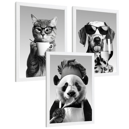 Set de 3 Láminas Animales Divertidos Blanco y Negro Cuadros Cocina Gato Dálmata y Panda Chef Póster Decoración Pared
