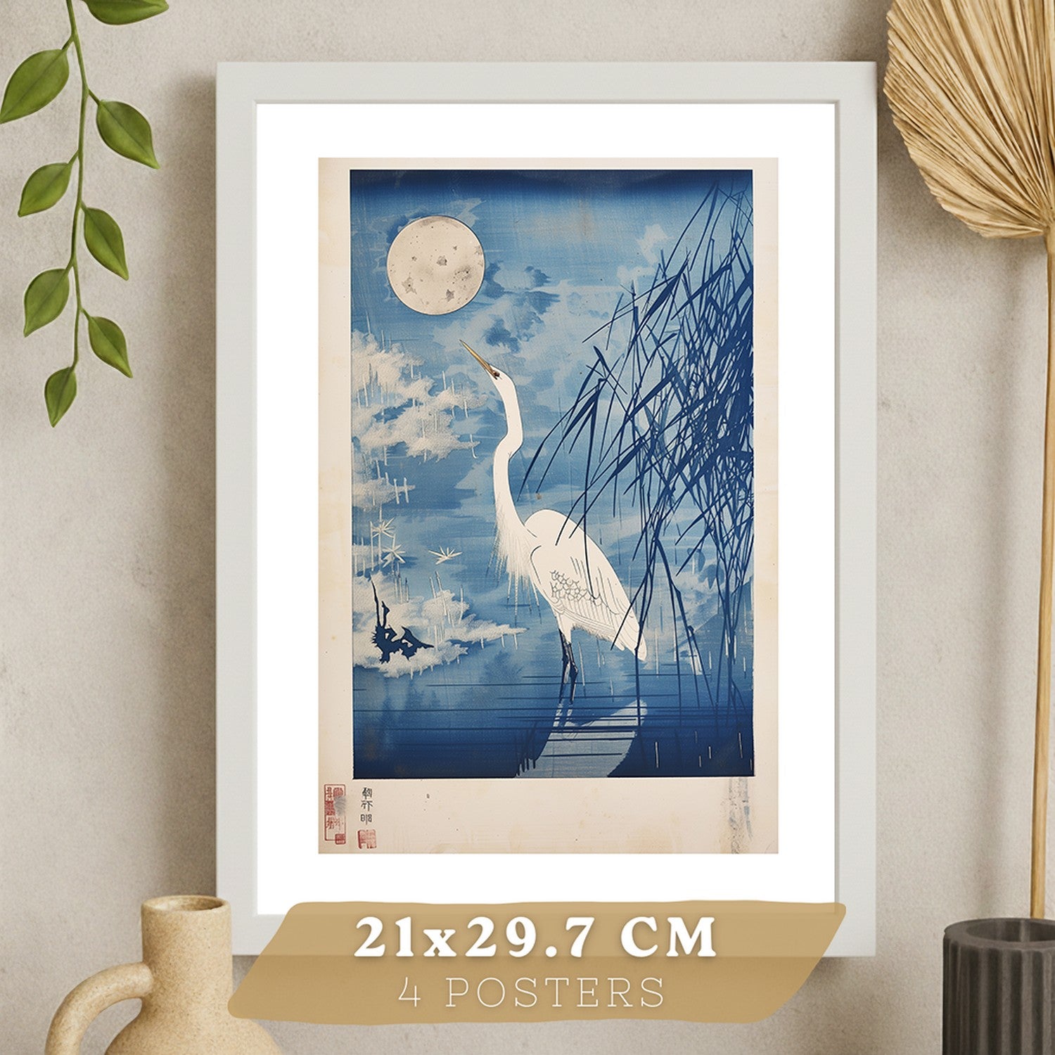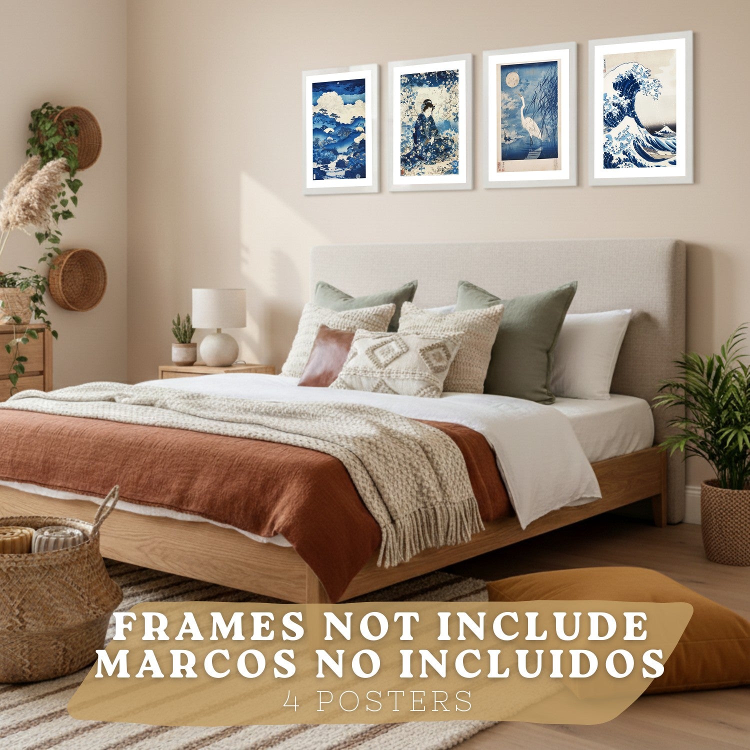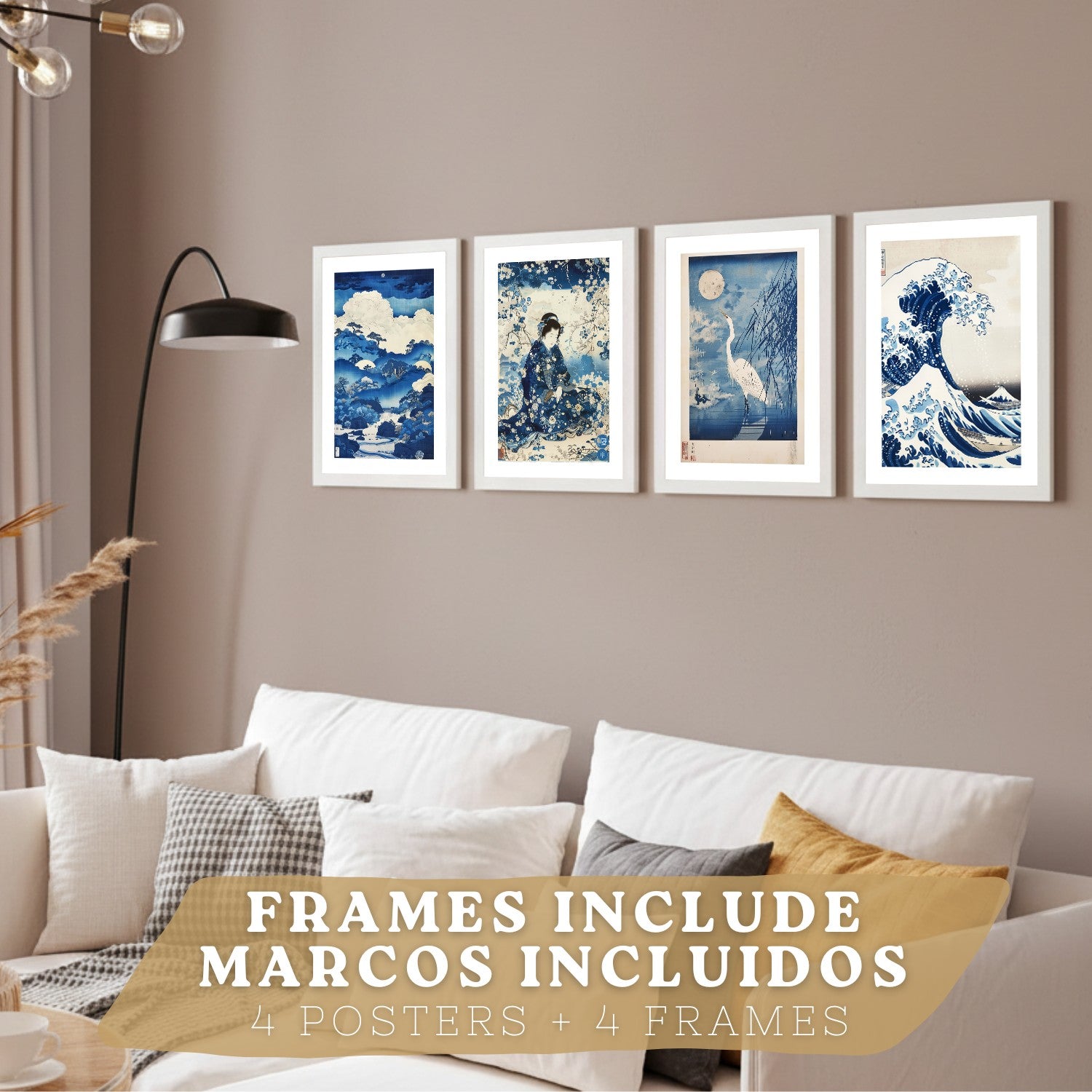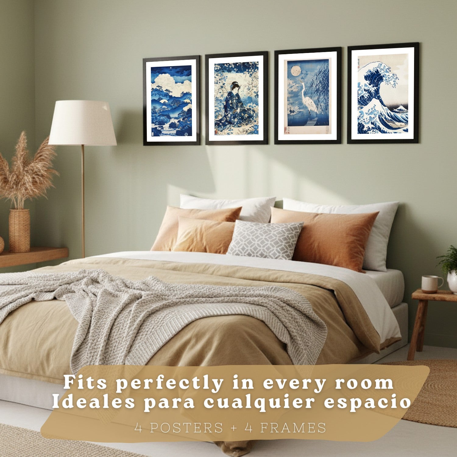 Juego de 4 laminas decorativas pared estilo Japon. Cuadros Salon modernos - Posters decorativos azules orientales. Arte japones. Decoración Dormitorios.