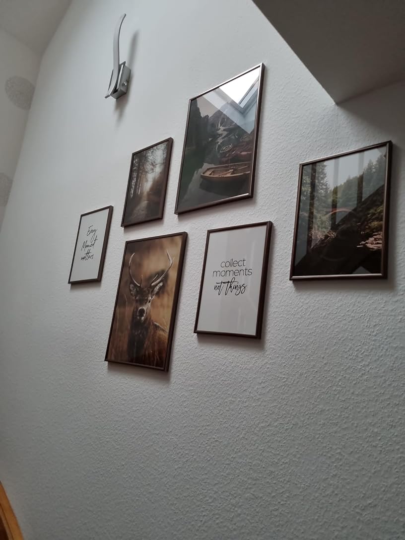 Set de 6 pósters fotográficos de naturaleza con ciervo, bosque, lago alpino y frases inspiradoras – estilo nórdico moderno para salón, dormitorio o estudio – tonos tierra, verdes y madera