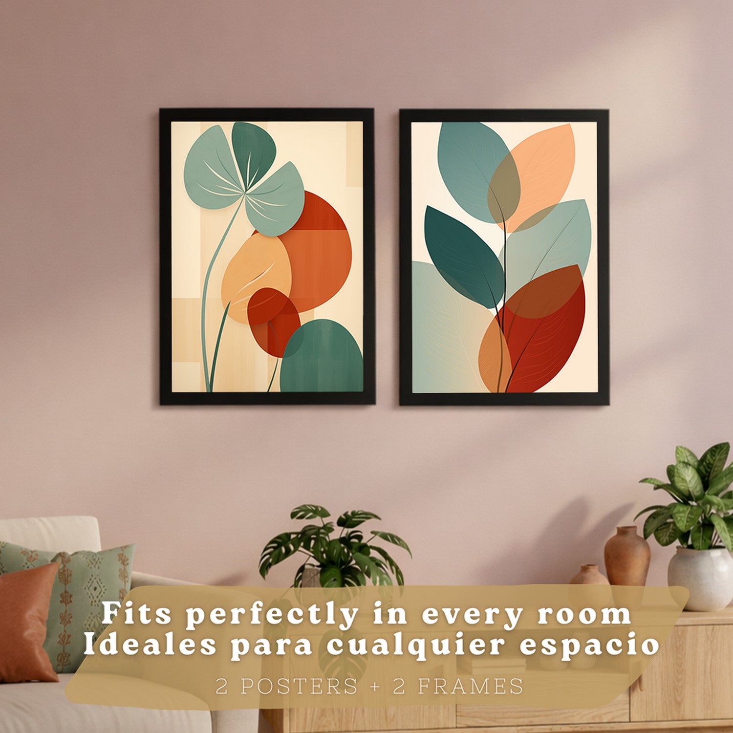 Set de 2 laminas decorativas Hojas, plantas y flores Cuadros Salon modernos - Posters decorativos Botanica verde naranja. Decoración Dormitorios.