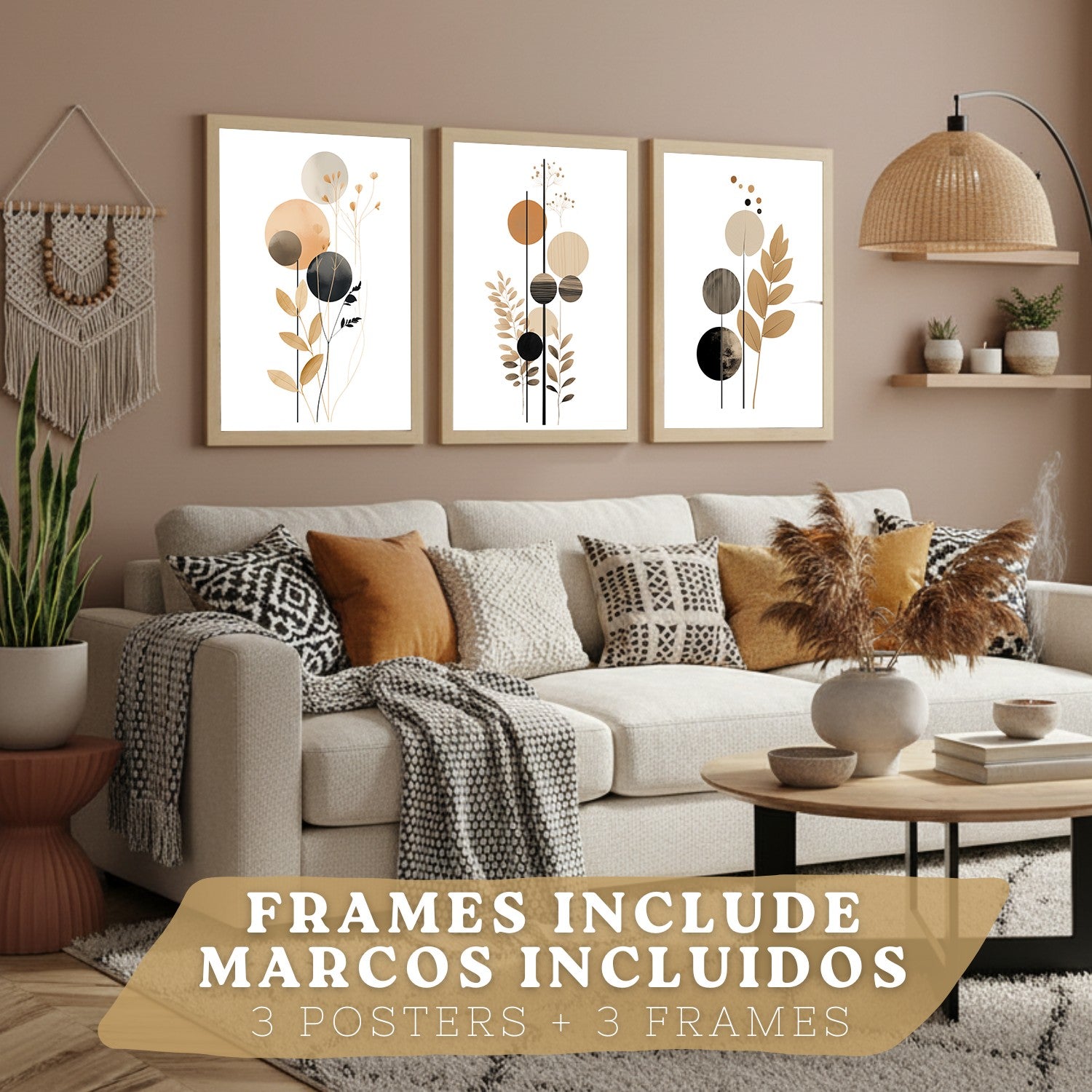 Set de 3 laminas decorativas Flores Geometricas Cuadros Salon modernos - Posters decorativos Tono marron y negro. Decoración Dormitorios.