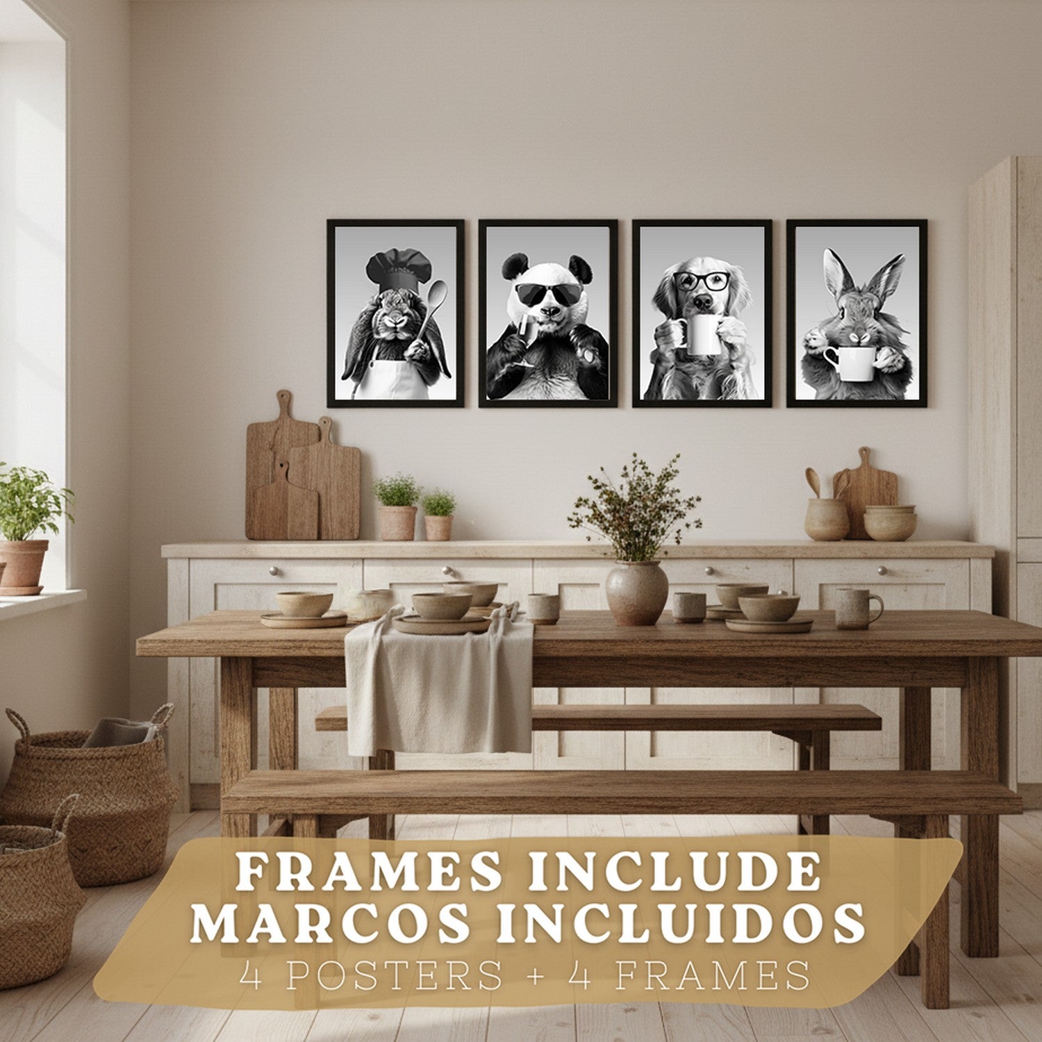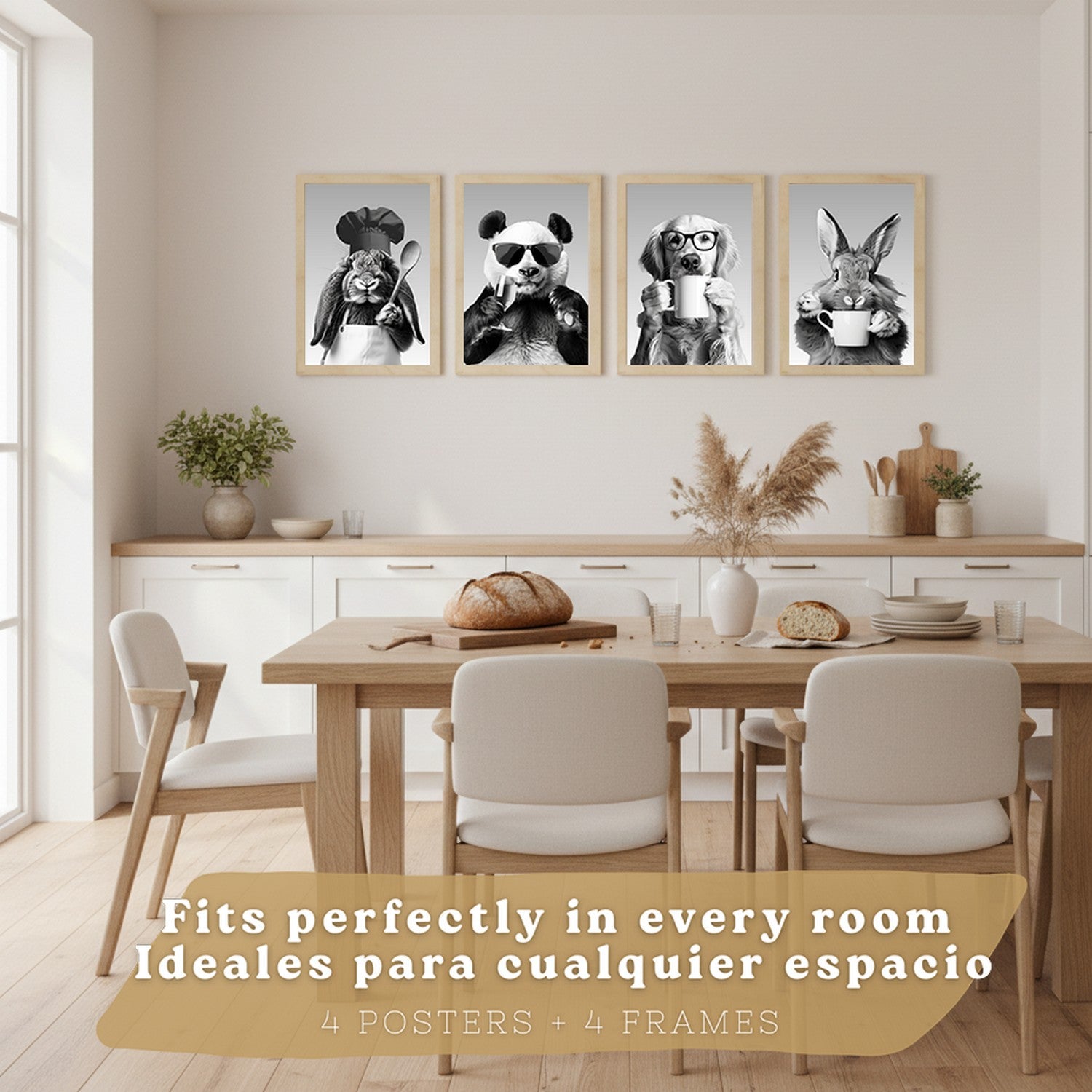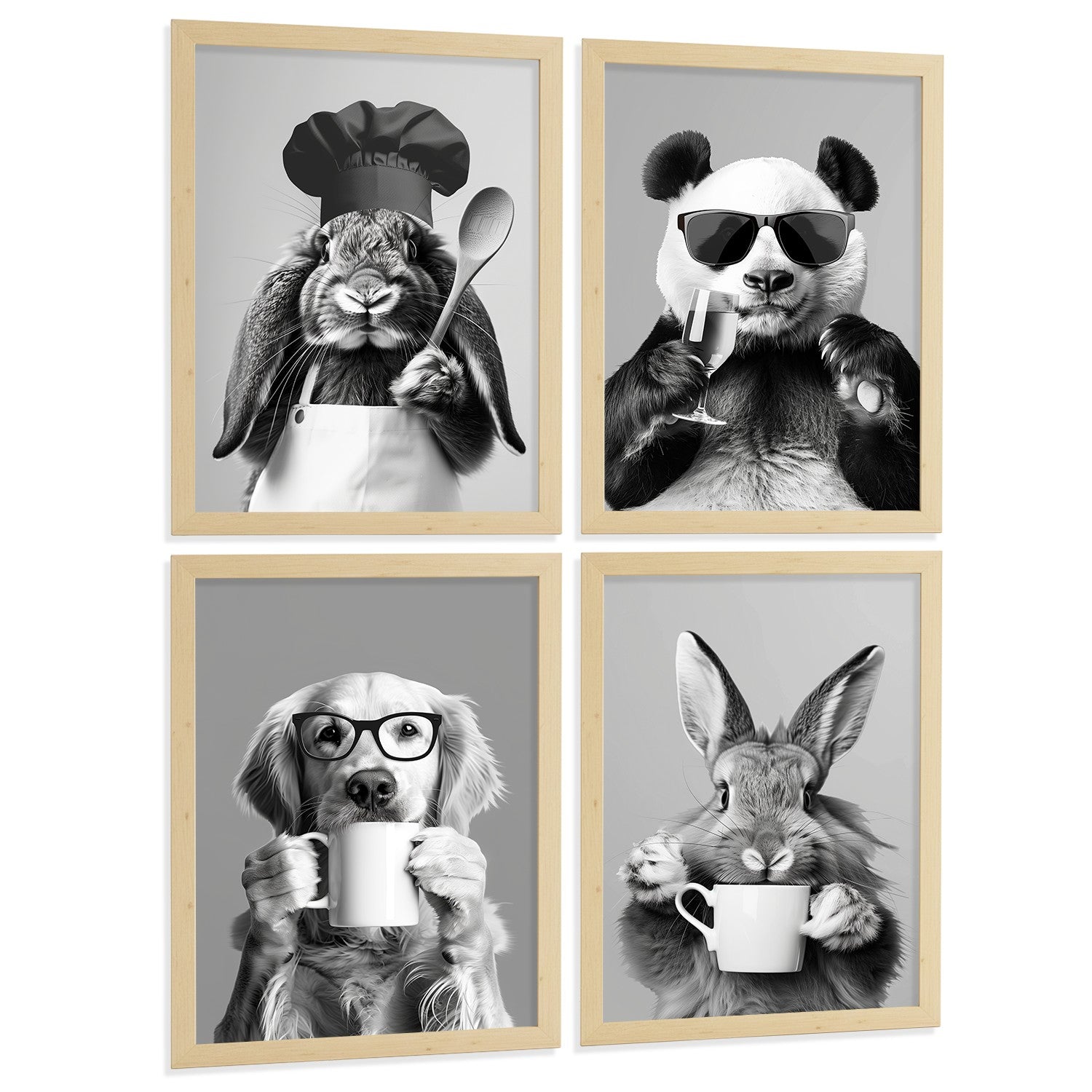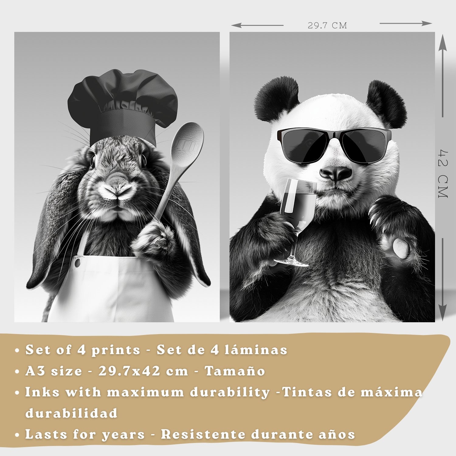 Set de 4 Láminas Animales Graciosos Blanco y Negro Cuadros Cocina Conejo Panda y Perro Golden Póster Decoración Pared