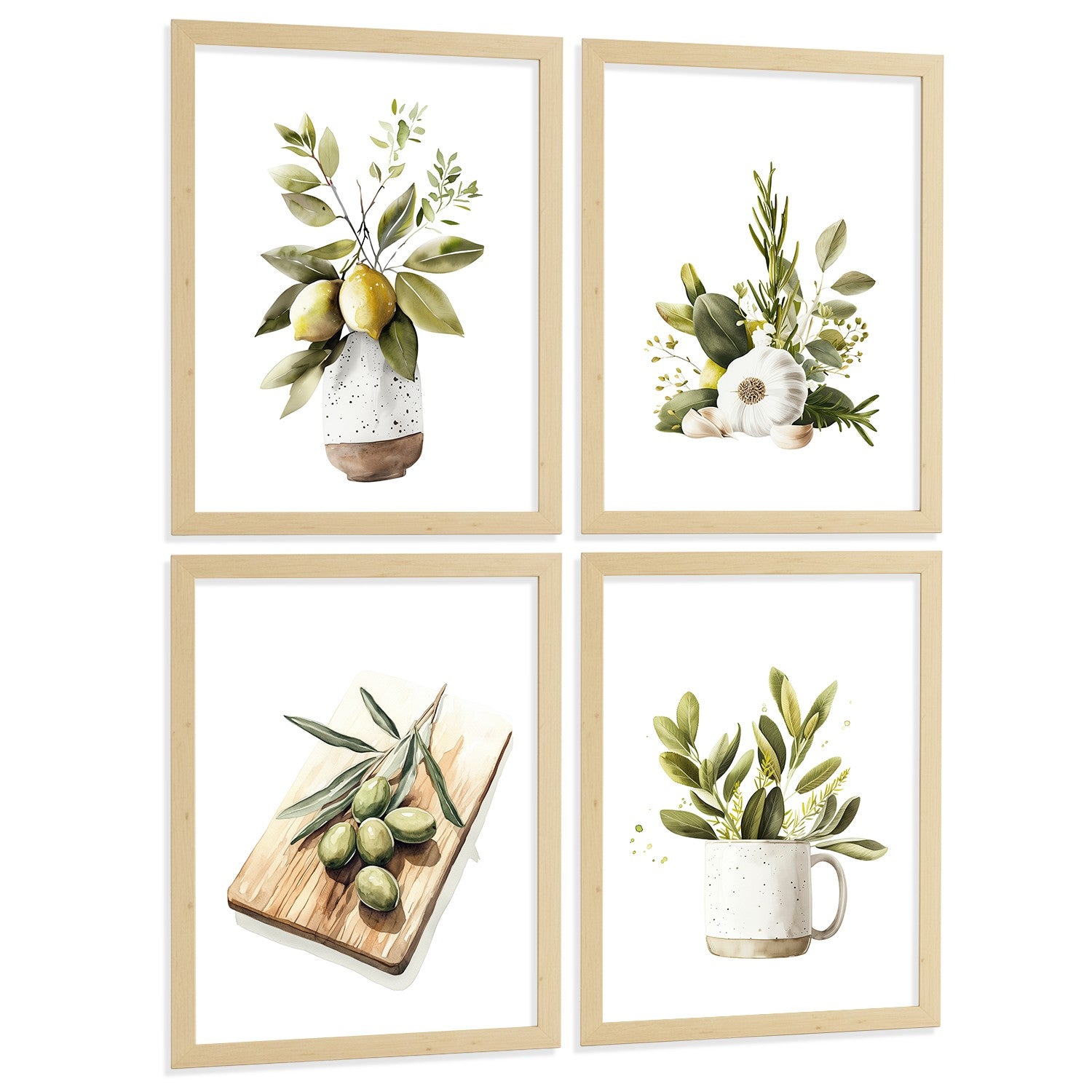 Set de 4 Láminas Cocina Mediterránea Acuarela Cuadros Pared Limones Ajo Aceitunas y Hierbas Aromáticas Póster Decoración Comedor